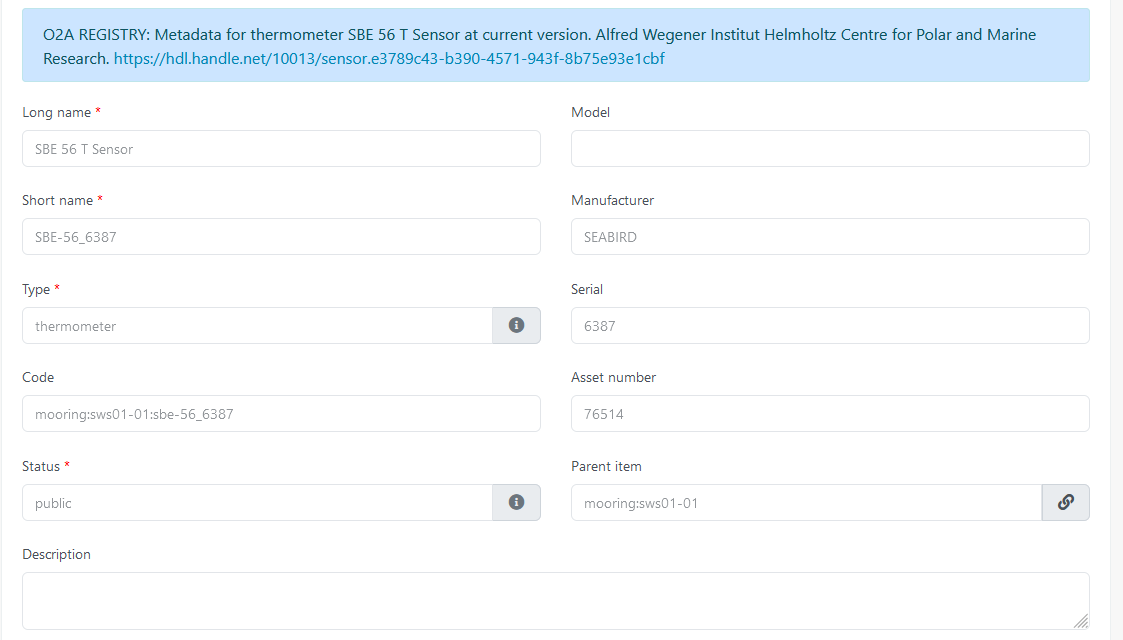 [edit | edit source]The registry is a metadata database for platforms, devices and sensors or product related information. Within the SOOP data framework the O2A registry offers to store essential metadata about SOOP obsveration technologies, such as sensor information (e.g. unique sensor ID = UUID, type, parameter, accuracy, manufacturer, calibration details etc.), or information about observation vessels (e.g. vessel name, owner, campaign etc.). It is therefore an important component for SOOP by enriching data measured by ships of opportunity with information about the measurement technolgy.
